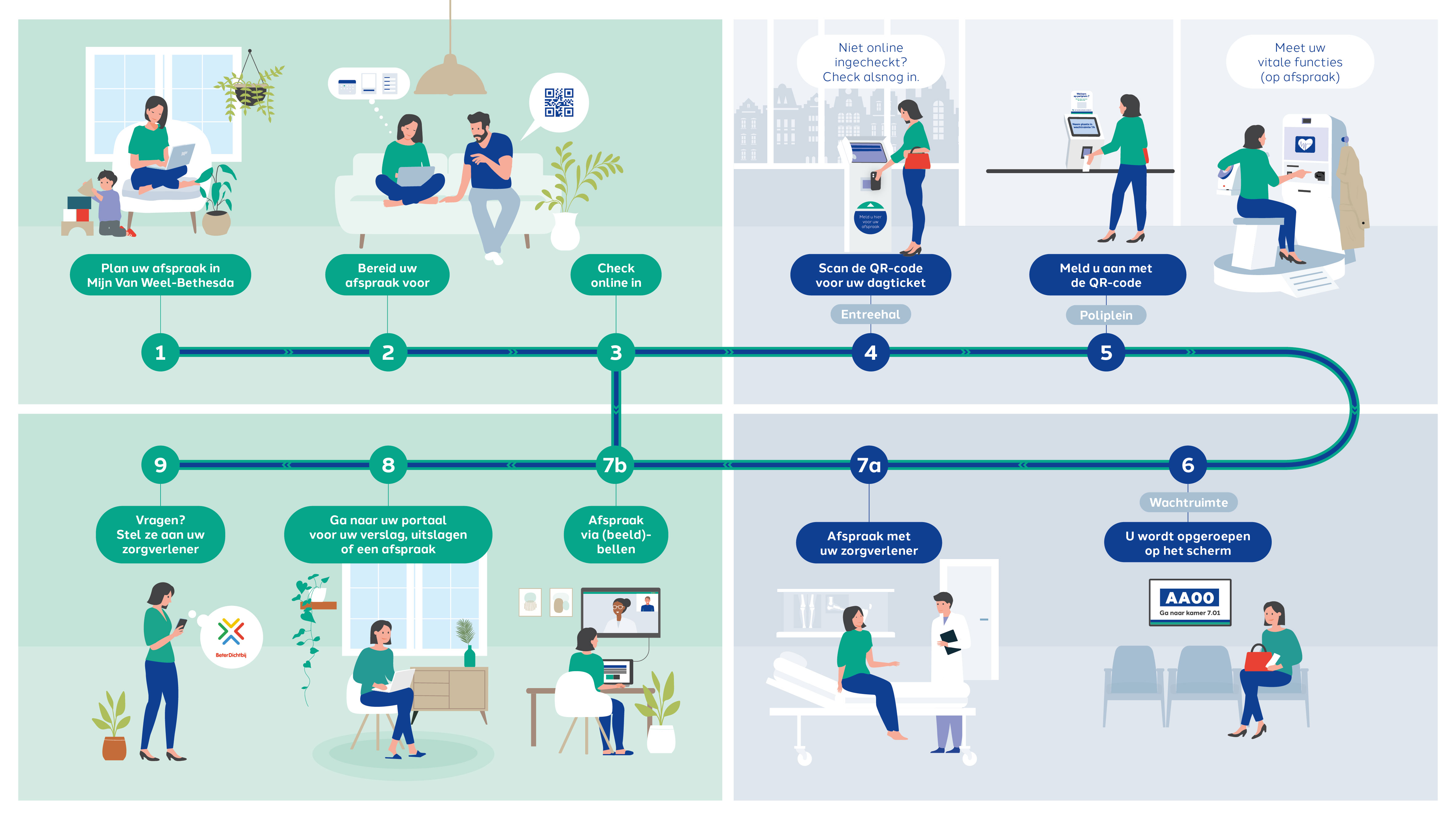 Ook in Het Van Weel-Bethesda Ziekenhuis wordt de zorg digitaler. U krijgt bij ons persoonlijke zorg op de juiste plek. Thuis als het kan en in het ziekenhuis als het nodig is. Steeds meer zorgzaken regelt u zelf, op het moment dat het u uitkomt. U kunt online afspraken maken, uw uitslagen bekijken in Mijn Van Weel-Bethesda, een bericht sturen of videobellen met uw zorgverlener en voor uw afspraak uw vitale waarden meten. Zo houdt u meer inzicht en regie over uw eigen zorg en gezondheid en hebben onze zorgverleners meer tijd voor persoonlijke zorg. Passende zorg maken we samen.
